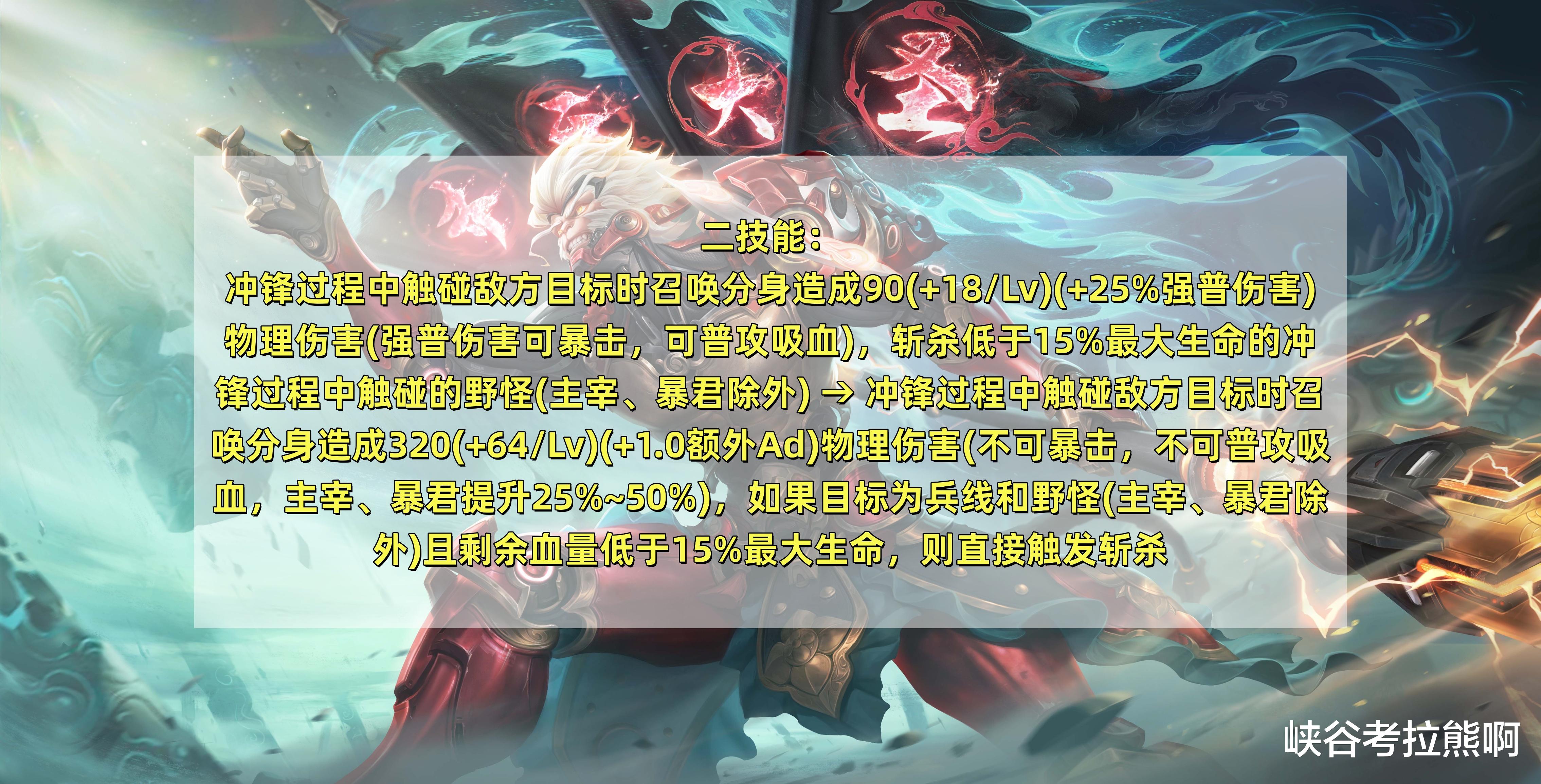 二技能分身的普攻基础伤害提高,控龙能力也得到极大提升,15%的血量斩杀线对小兵也会生效,代价是25%强普伤害改为了额外物理伤害,且移除了吸血和暴击效果。
