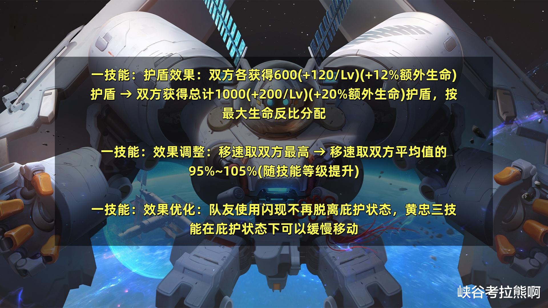 一技能为双方提供的护盾值降低,托举状态下血少的会分配更多护盾,且移速也会变慢。最为补偿,队友使用闪现不再会脱离庇护状态,黄忠在三技能庇护状态下可缓慢移动。