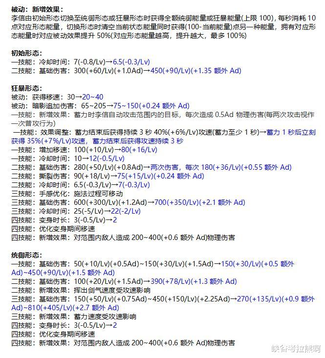 以上为李信目前的全部调整内容,我帮大家做了一个相对清晰的梳理,就目前的数值和机制的调整来看肯定属于加强,能否回归老版巅峰不好说,但起码解决了不少痛点问题。