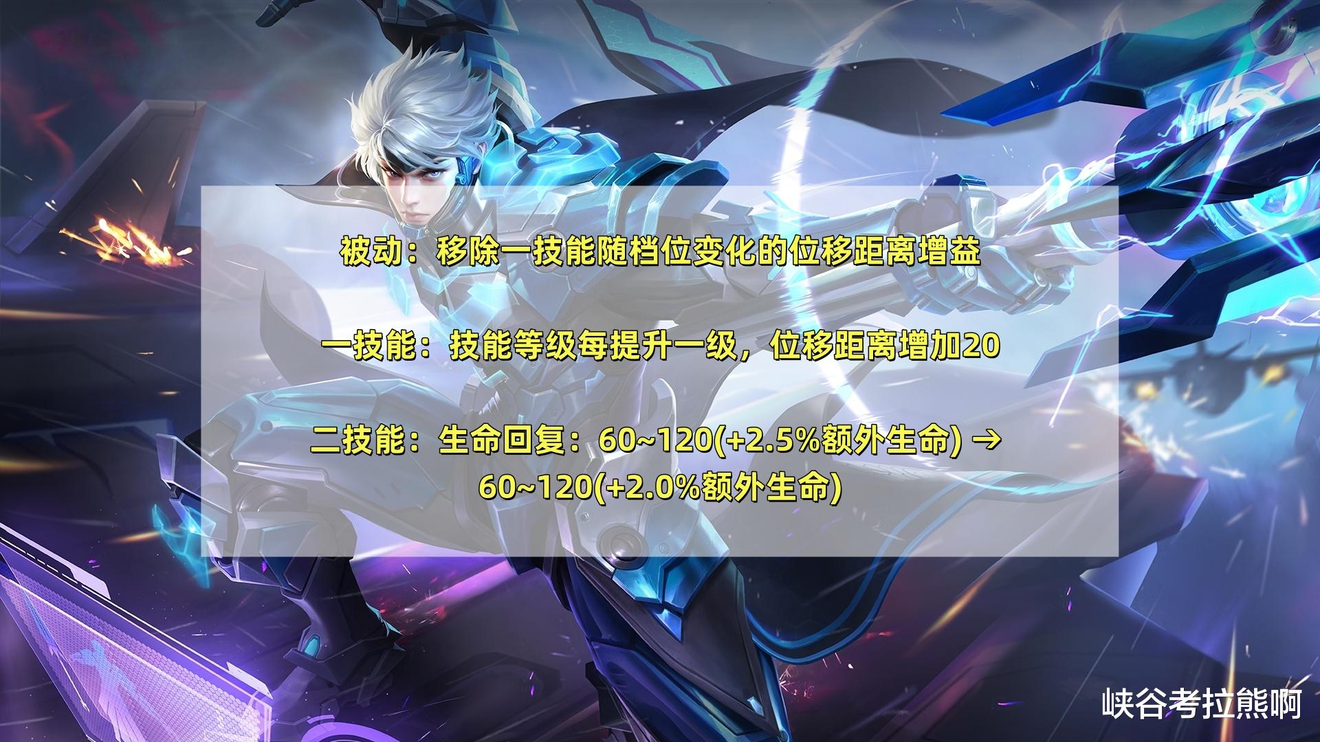 本次移除了一技能随档位变化提高位移距离的被动效果,并将一技能改为了每提升一级,位移距离提高20码,满级效果和之前一样,但二技能回血效果略有降低。