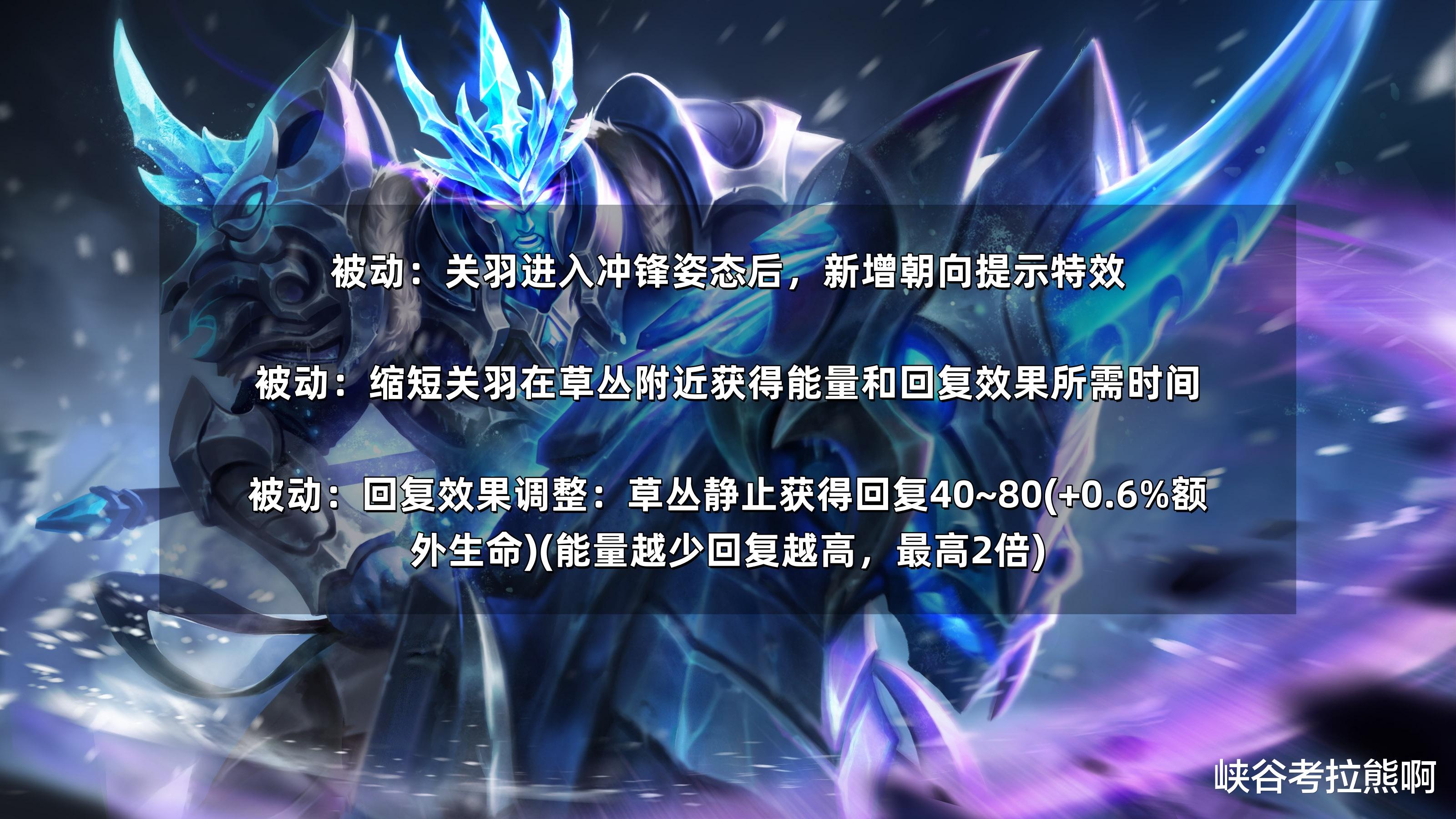 本次缩短了关羽在草丛附近恢复能量和血量所需的时间,且能量越少时回血能力越强,而冲锋状态下还新增了朝向提示效果。