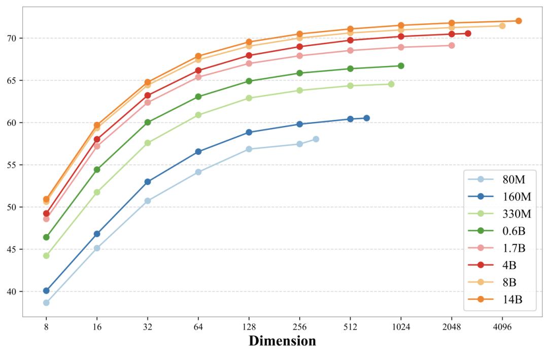 轻量级(80M / 160M / 330M):适用于对延迟极其敏感的终端应用。主流级(0.6B / 1.7B / 4B):兼顾性能与效率。重型(8B / 14B):为企业级检索系统提供最高精度的语义表征。值得关注的是,通过模型剪枝和知识蒸馏技术,小尺寸模型在推理效率大幅提升的同时保留了强大性能,打破了“小模型无高性能”的迷思。