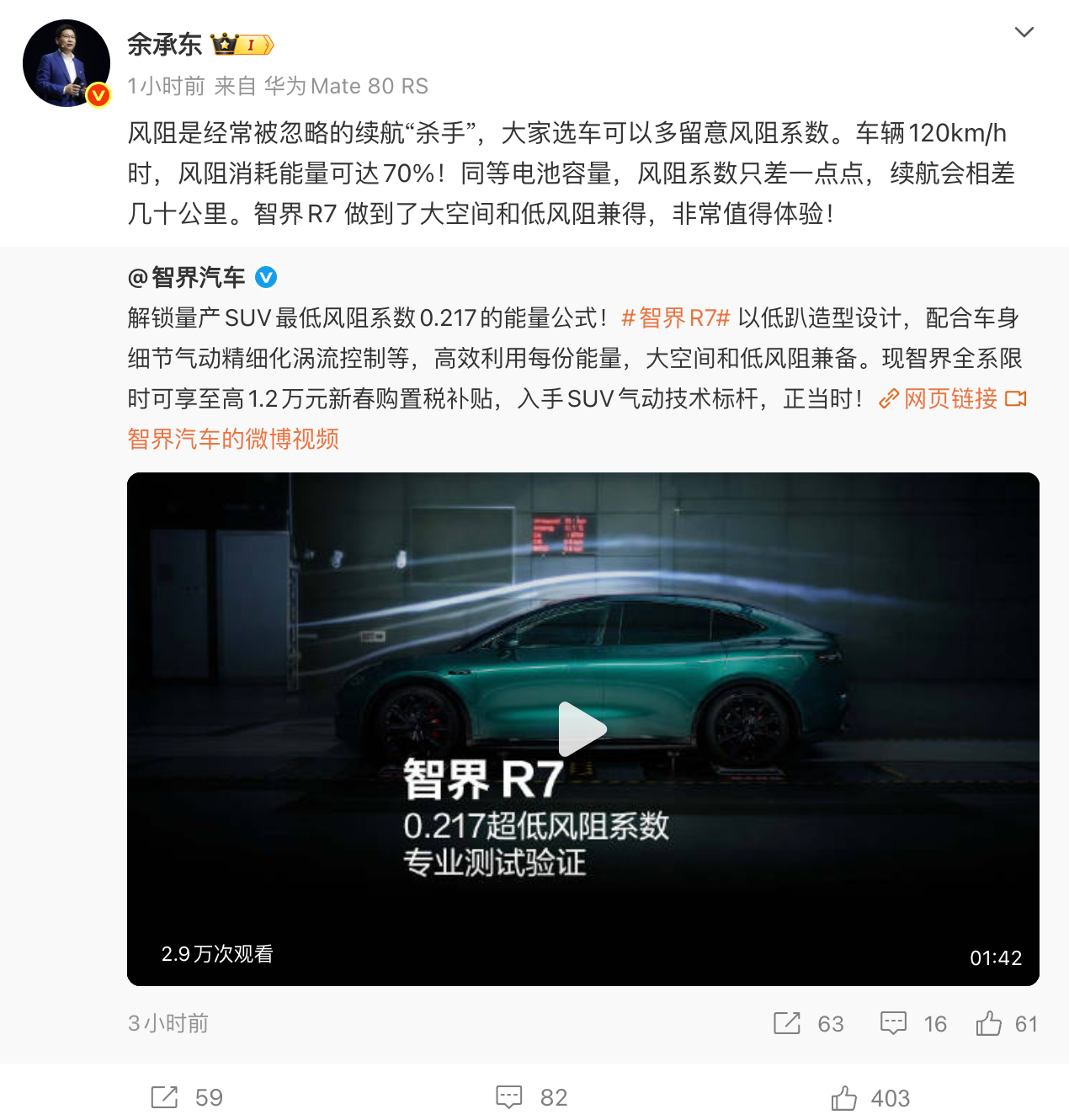 2026年1月22日,智界汽车官方发文称,智界R7获中国汽研认证,创全球量产SUV最低风阻系数0.217。对此,华为常务董事、产品投资评审委员会主任、终端BG董事长余承东表示,风阻是经常被忽略的续航“杀手”,大家选车可以多留意风阻系数。