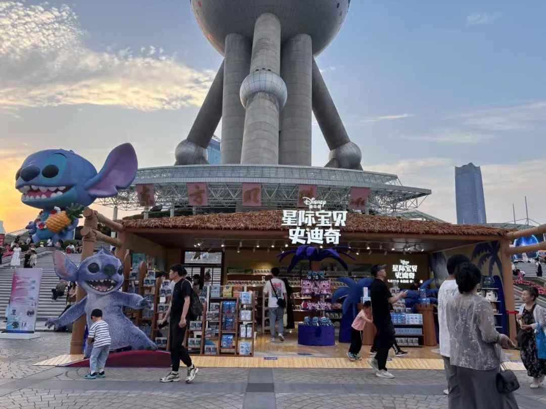 针对亲子与怀旧群体,东方明珠塔则引入迪士尼、孩之宝等经典IP资源。13米高史迪奇、12米高小猪佩奇相继空降, 哆啦A梦主题CAFÉ推出限定周边, 均带动客流与消费显著增长。
