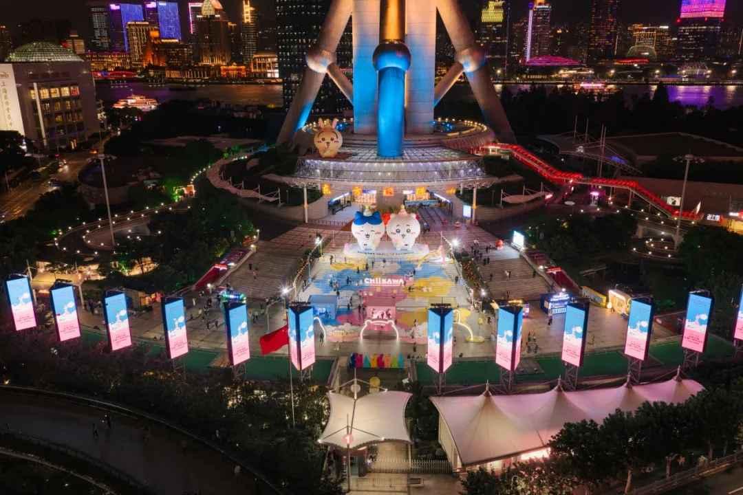 以刚过去的10月与chiikawa的联动为例,东方明珠塔实现“水陆空”三维覆盖。地面广场打造耳朵造型门头与三色主题楼梯,259米高空玻璃栈道首次开放IP联动装饰,“上海之星”游船全面焕新主题画面, 配套任务打卡赠周边活动。