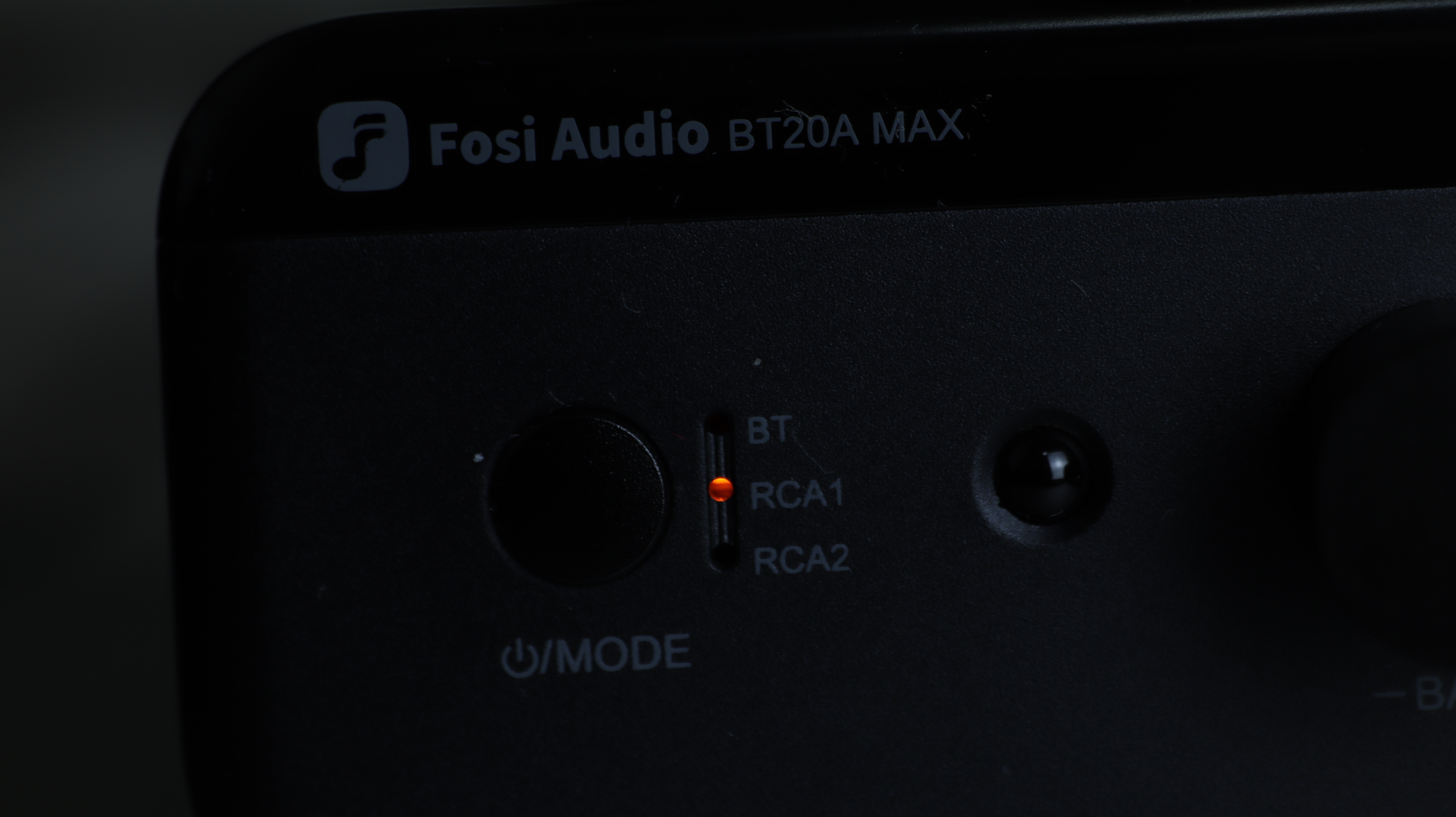 外观设计上,BT20A Max采用了黑橙配色的撞色设计,前面板是哑光黑色,中间横贯一条亮面橙色饰条,把电源键、输入切换键、高低音调节旋钮和音量旋钮清晰分隔开,视觉层次感很强。边角做了圆滑过渡处理,不仅避免了尖锐边角的磕碰风险,也让整体质感更显精致。