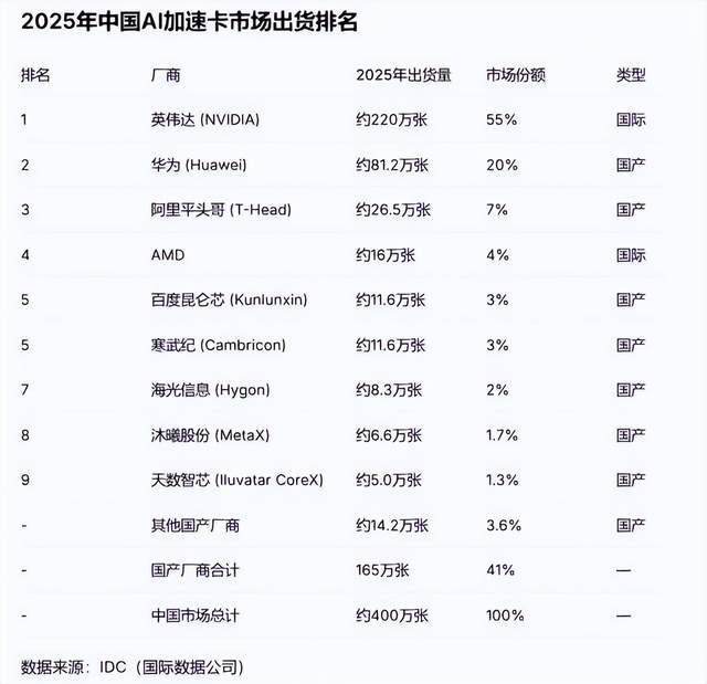 这个数据,其实也可以通过IDC的数据来佐证,IDC的数据也显示,2025年,中国市场国产AI芯片出货量占比是41%,国外是59%,其中英伟达占55%,AMD占4%左右。