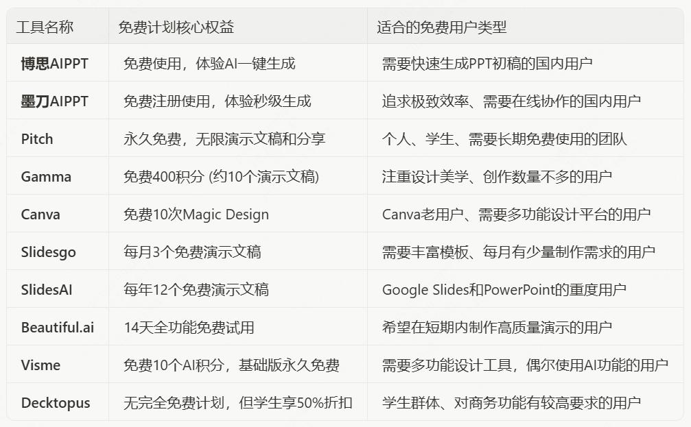 为减少大家在选用AI PPT工具做出的决策成本,我们将这些AI生成PPT工具的免费权益整理为下图的表格,方便大家进行直观的对比: