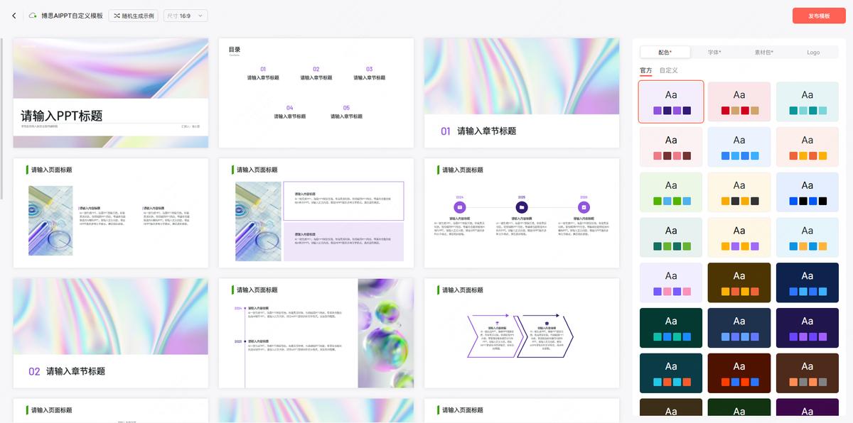 •自定义模板,可全局调整PPT的配色、字体、素材包和Logo图标,存储为自定义模板,在后续生成PPT时可重复使用,保证PPT视觉的一致性