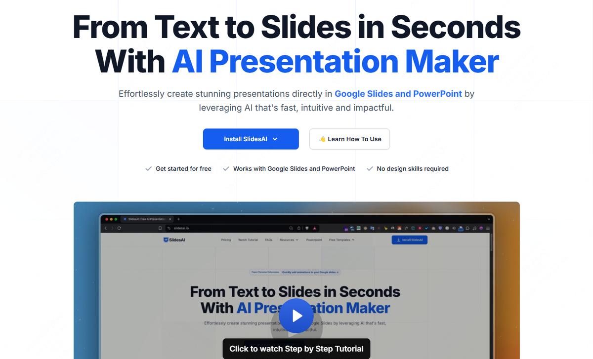 SlidesAISlidesAI是一款专注于与Google Slides和PowerPoint无缝集成的AI演示文稿生成工具。它的最大特点是,你可以在你已经熟悉的平台上直接使用AI功能,无需学习新的软件操作,极大地降低了上手门槛。你只需输入文本、脚本、笔记,甚至是一个链接,SlidesAI就能为你自动生成演示文稿。