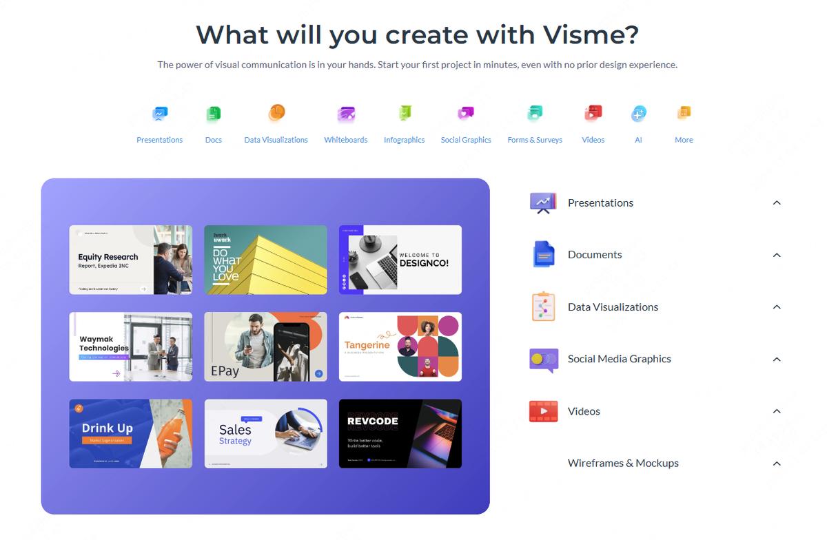 对于需要创建多种类型视觉内容的用户来说,Visme是一个一站式的解决方案。不管你是营销人员、教育工作者还是企业培训师,都能在Visme上找到满足需求的工具。