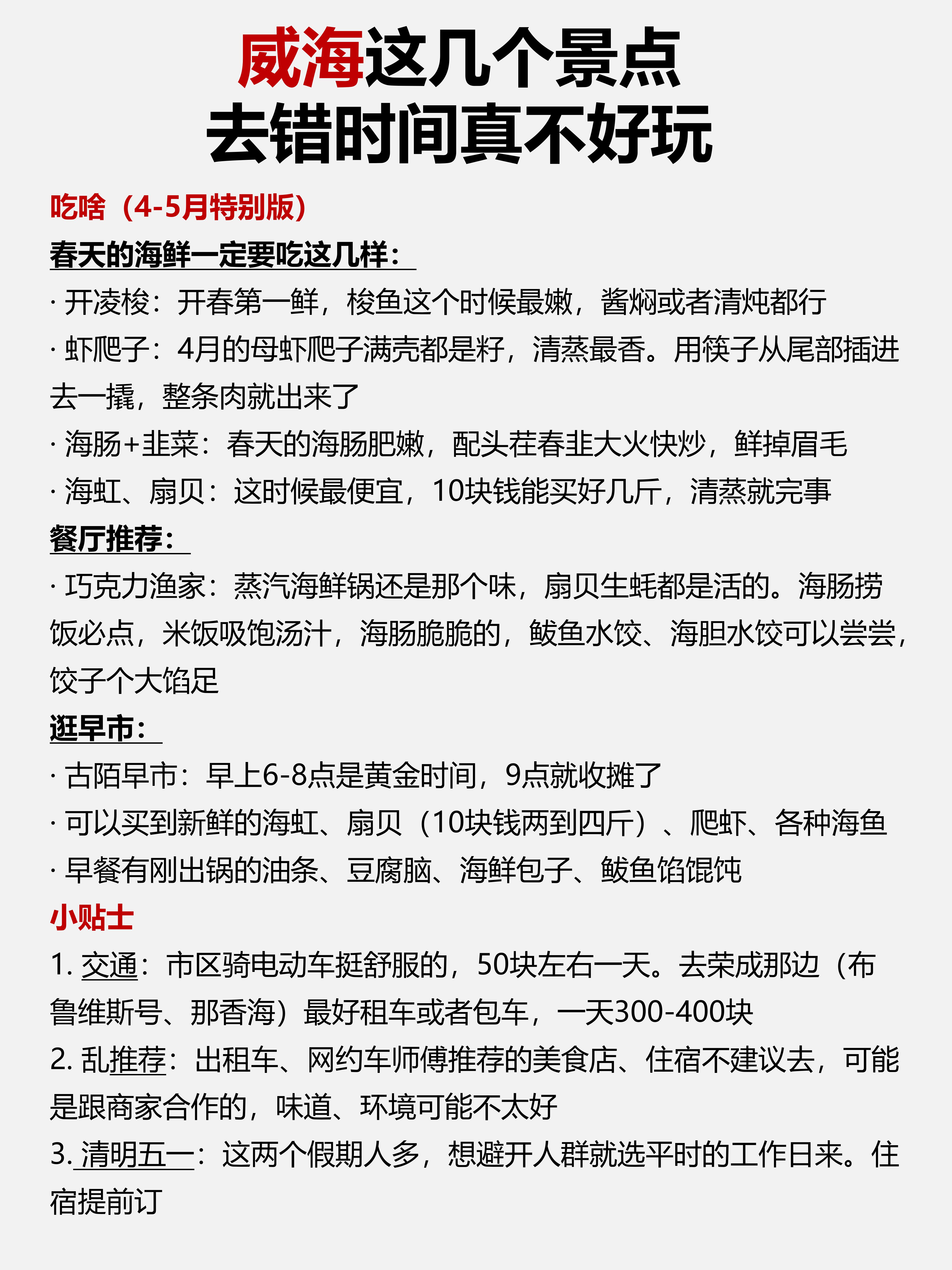 4-5月来威海,天气舒服多了!风也没冬天那么狠了,白天十几二十度,穿个薄外套就行。这时候最大的好处是——花开了,海鲜正是最肥的时候,还不像暑假那么挤!