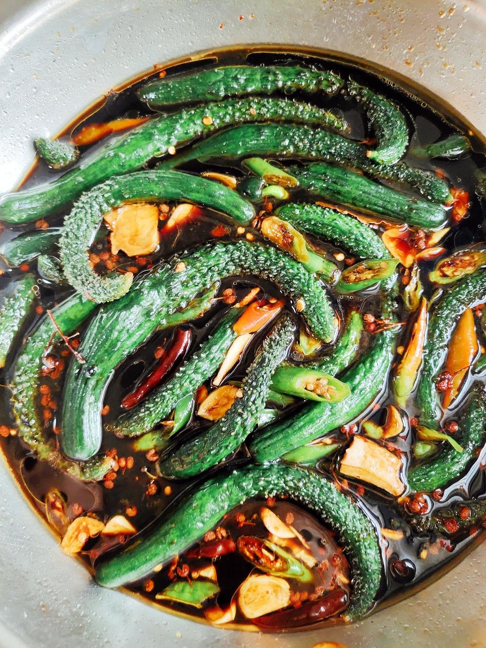 材料:小黄瓜、蒜、姜、辣椒、花椒、八角、盐、糖、白醋、凉白开。