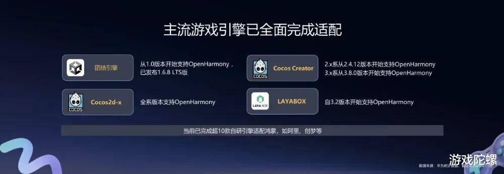 Cocos、团结引擎、LayaBox等主流游戏引擎,以及FMOD、Wwise等常用的第三方SDK都已完成HarmonyOS或者OpenHarmony适配。这意味着开发者不需要从零开始,他们熟悉的工作流和工具链基本上可以平移过来。