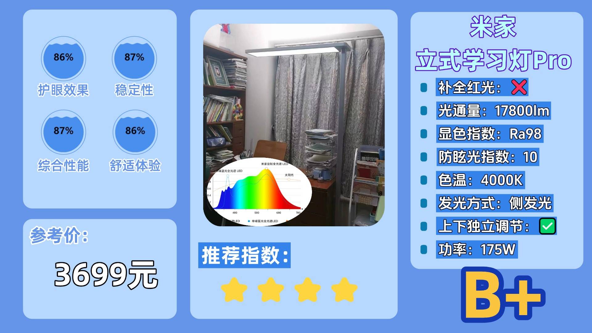 护眼大路灯第四名:米家立式学习灯Pro;灯光通量提升至约17800lm,亮度储备十分充足。