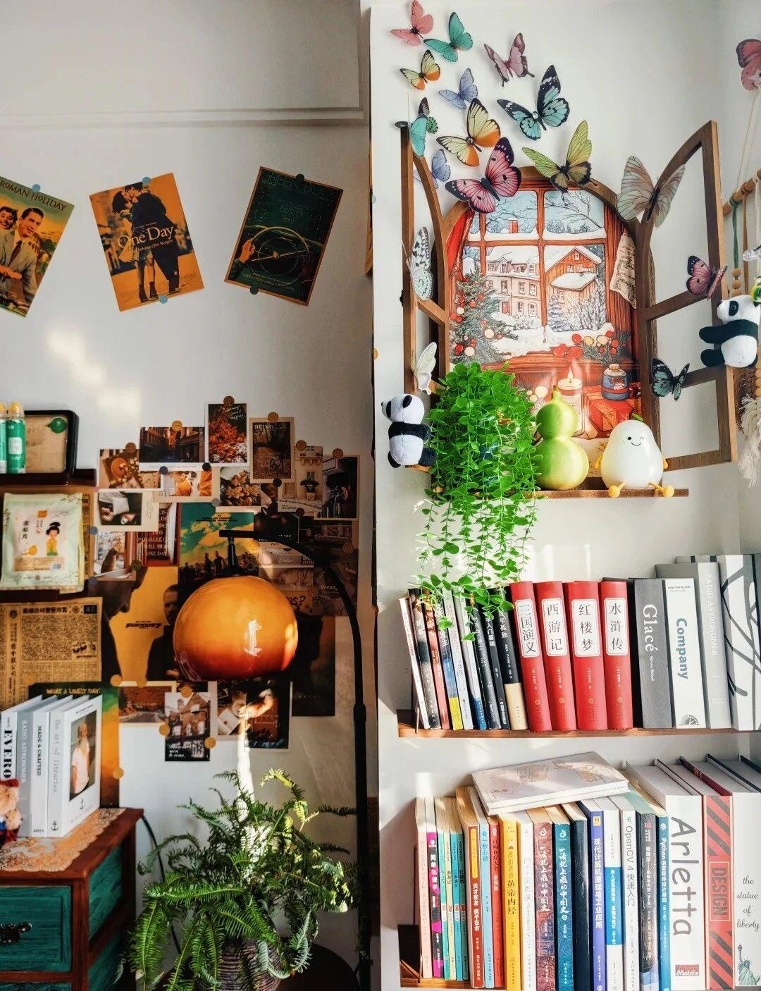 飘窗侧墙的布置也是一样,安装了置物书架,上方还安装了一个假窗框,下沿可以摆放常春藤、葫芦、小熊猫、蝴蝶等摆件,太萌了。