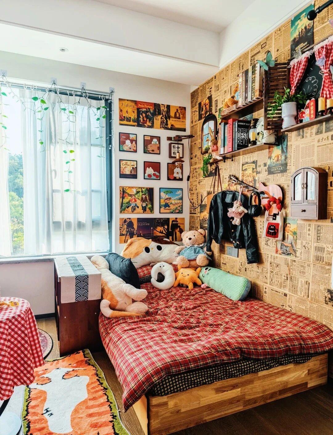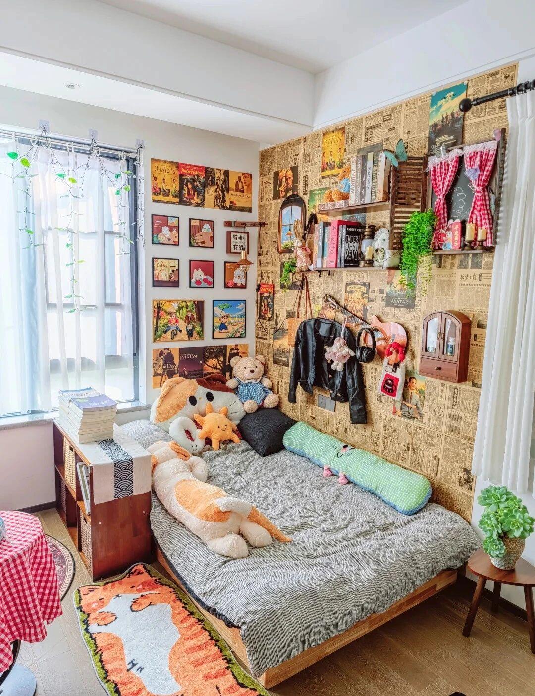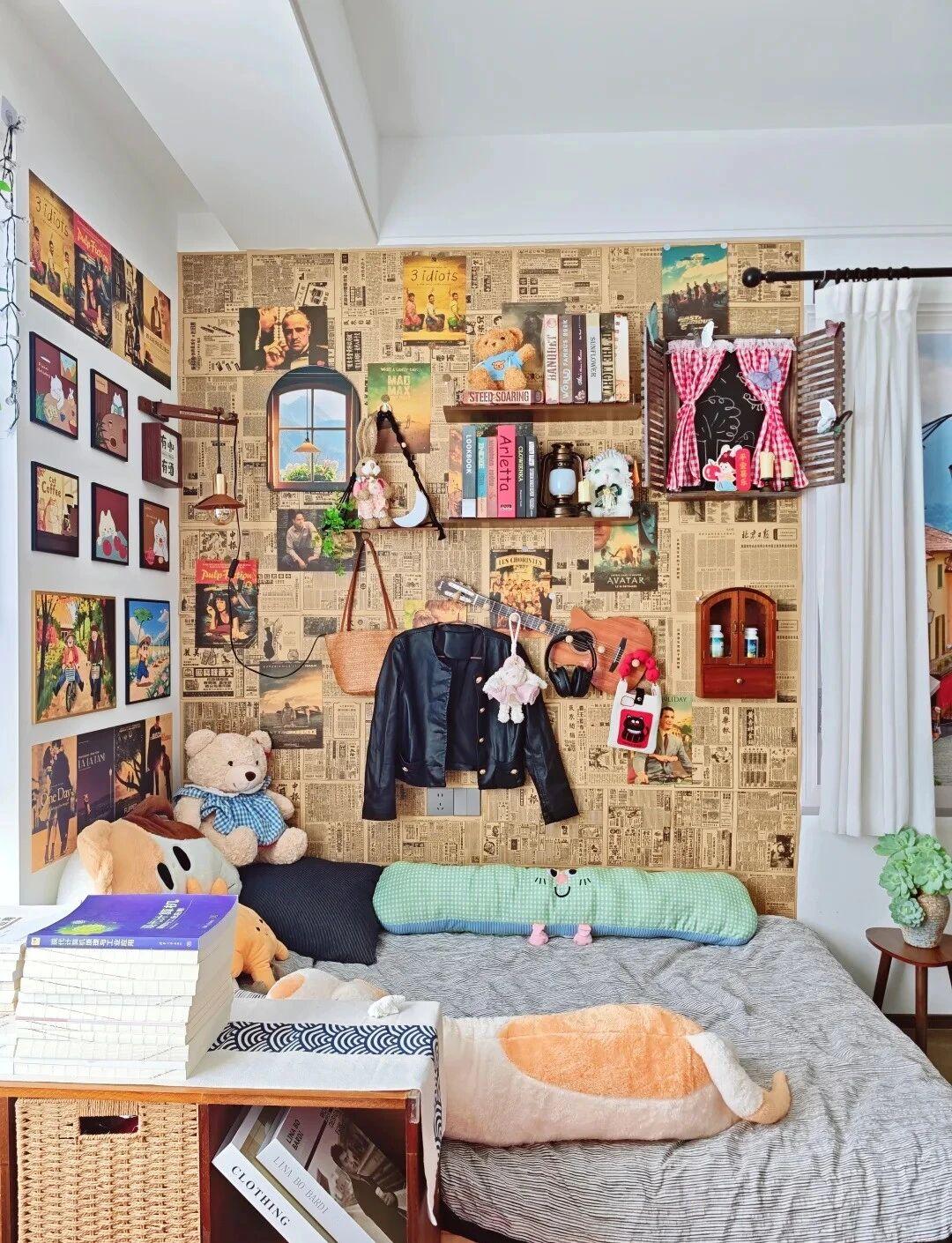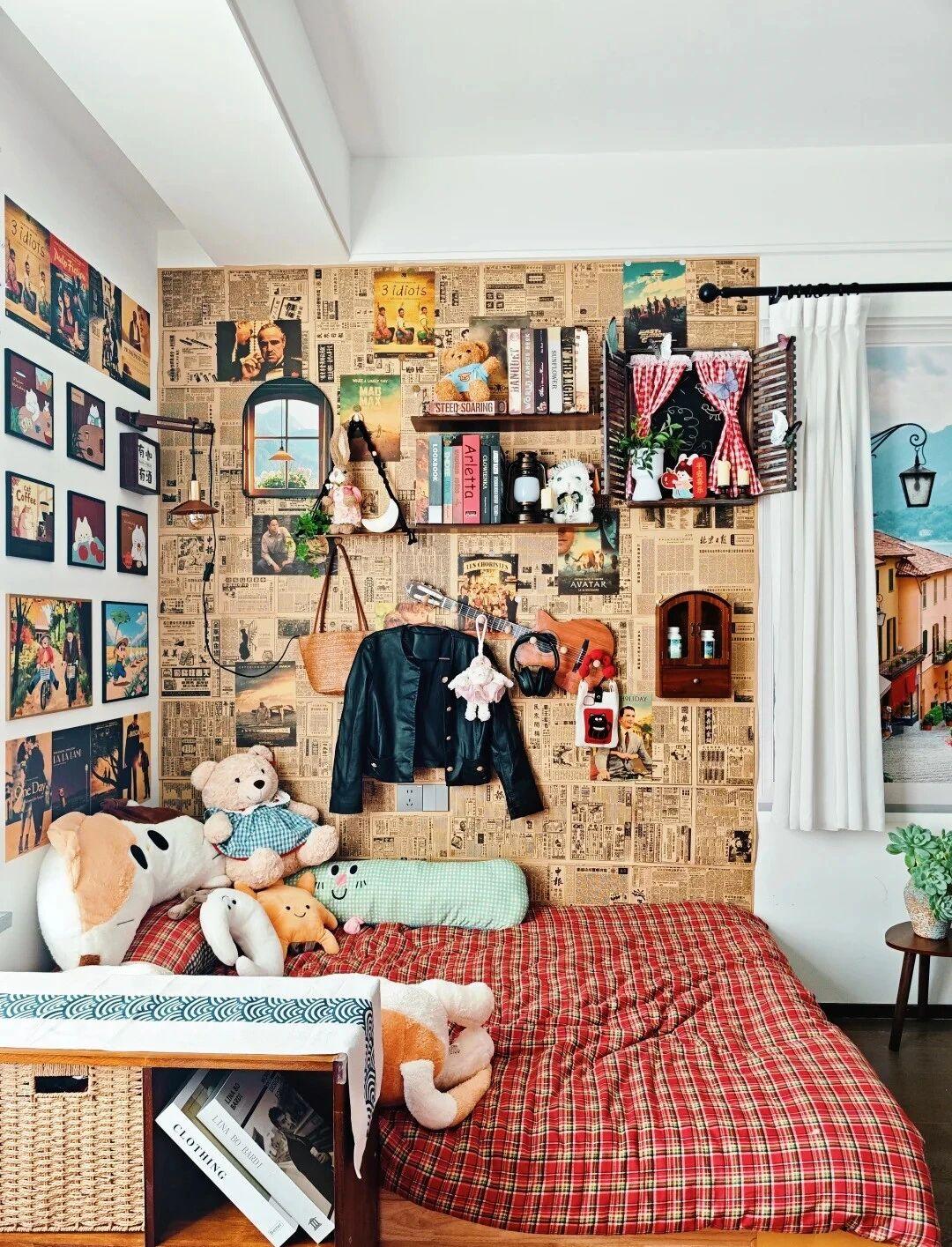 床的右侧则利用复古牛皮报纸打底,布置成一片复古报纸墙,而且选择的是美纹纸,所以后期撕掉的时候,也不会留痕。