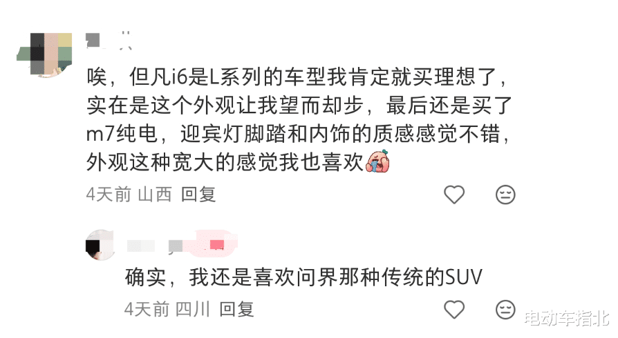 随便打开各大平台的帖子,下面都能看到类似「不像是 SUV」、「更希望 i6 是 L 系列造型的外观」的回复。