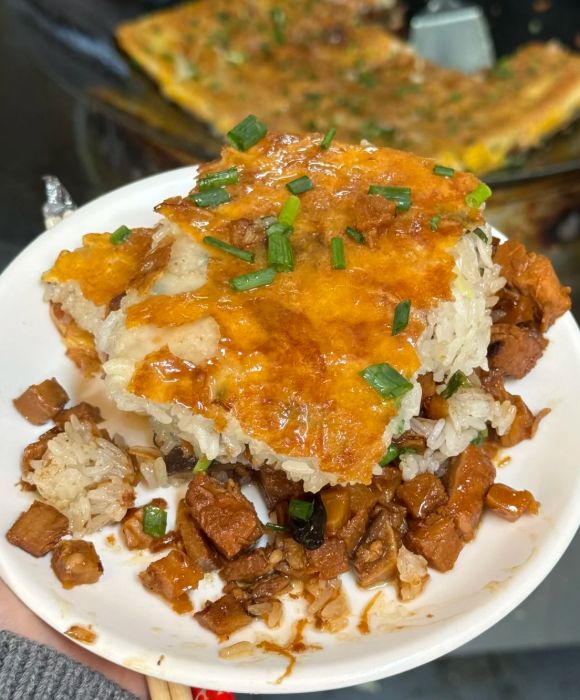 豆皮是单独成餐的。老通城的豆皮最有名,但街边小摊的也不差。糯米蒸熟,铺在煎锅上,摊平,上面盖一层蛋皮,蛋皮上撒三鲜丁——肉丁、香菇丁、笋丁,再浇上卤汁。翻个面煎,煎到蛋皮焦黄,糯米软糯,切成方块,铲进盘子里。咬一口,蛋皮酥香,糯米软糯,三鲜咸鲜,三种口感在嘴里打架,谁也不让谁。
