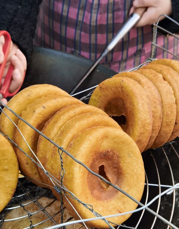 面窝是配着吃的。一碗热干面旁边,总要配个面窝。大米和黄豆磨成浆,加点葱花、盐,舀进特制的铁勺里,中间凸起一圈凹槽,下油锅炸。炸好的面窝中间薄脆,边缘厚软,咬一口,脆的嘎嘣响,软的糯叽叽。老武汉人吃面窝,喜欢掰碎了泡进面汤里,泡软了吃,又是另一种味道。