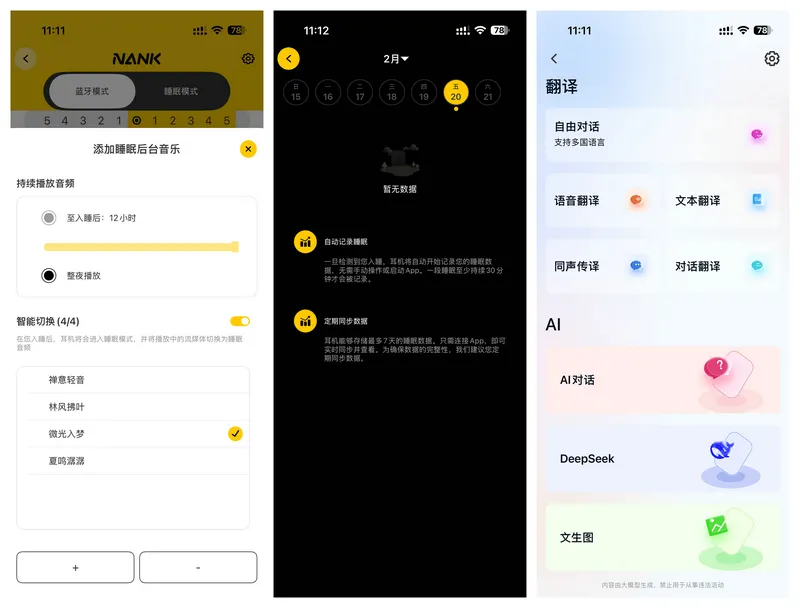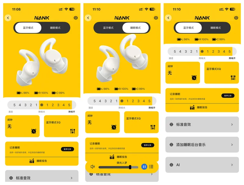 搭配南卡专属的APP拓展使用,可以更加方便快捷的设定耳机,通透到降噪的各5级调节,闹钟与蓝牙模式EQ的自主设定,记录睡眠、音效调节、添加睡眠后台音乐、AI各项选择都十分丰富方便快捷。