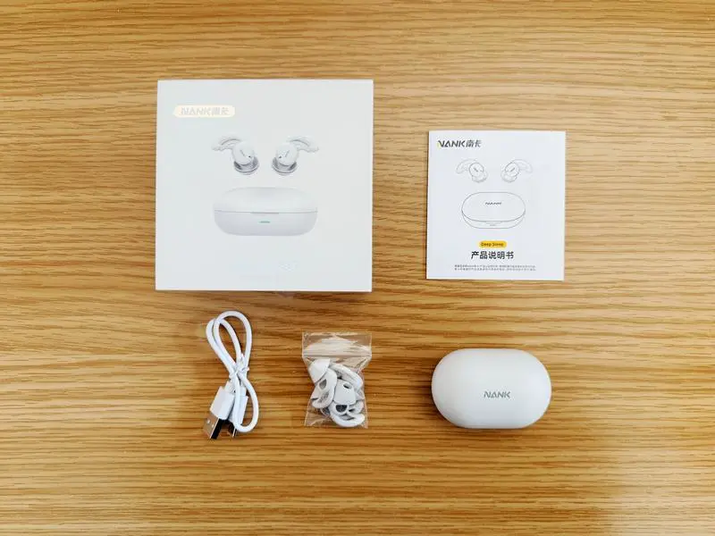 整个包装内含:南卡Deep Sleep睡眠耳机主机+便携充电仓,3 组不同尺寸的硅胶耳塞+2组适配耳翼,Type-C 充电线、产品说明书和保修卡与合格证。