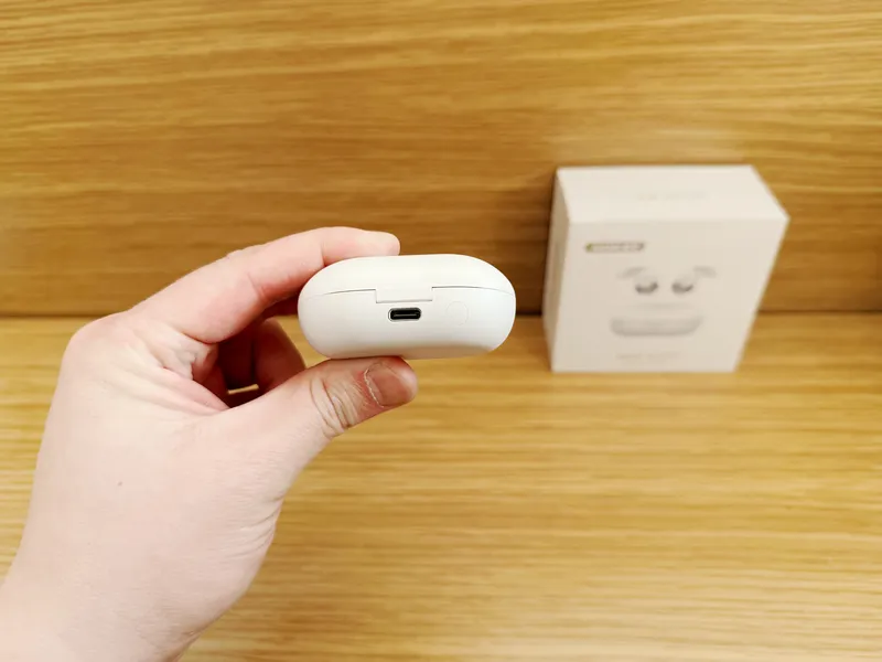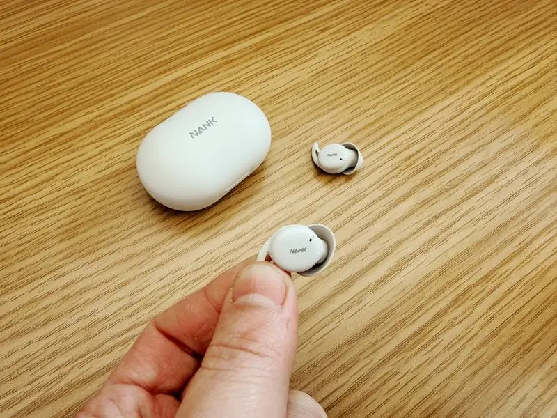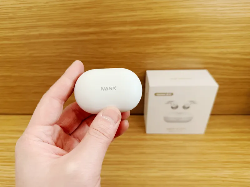 仓体正面印有NANK的logo标识,底部设有Type-C充电口与状态指示灯,侧面还设计了配对按钮。仓盖开合采用强磁吸设计,开盖闭合的阻尼感适中,清脆的咔嗒声质感十足。