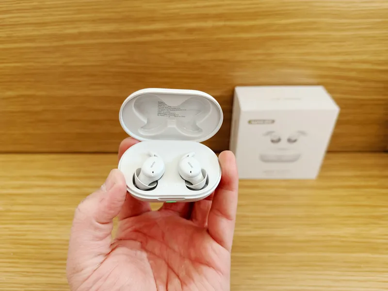 打开仓盖,耳机本体嵌在触点充电的凹槽内,哑光白的机身线条非常流畅,整体的外观设计完全服务于睡眠场景。耳机的轻盈质感也是非常赞的,单耳重量仅有3g,即使放在指尖也几乎感受不到重量。