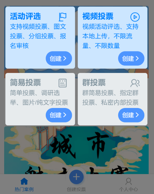 有活动评选、视频投票、简易投票、群投票模式。从而支持多图文或短视频的大型投票活动,同时也支持单图文简单的选举决择投票,还有就是可以限定在微信群里做投票