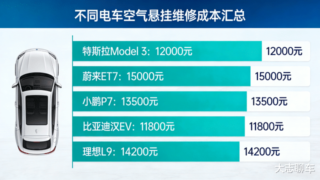 而且修车也能让车主掉眼泪,根据2024年发布的一项文件显示,各大电车主力品牌的空气悬挂修车都不便宜,最贵的蔚来ET7修一次要1.5万,最便宜的比亚迪汉EV,人家维修也在11800元,这还是比亚迪的,其他车型的空气悬挂,也都在上万元的价格,并且,保养的时候,这个空气悬挂还需要车主单独保养。