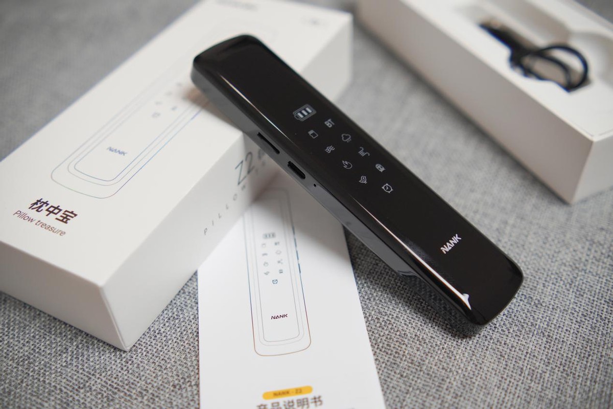南卡枕中宝Z2外包装简约,上面刻画着产品简图和主要功能图标。打开包装就是枕中宝主机,以及Type-C充电线以及使用说明书。