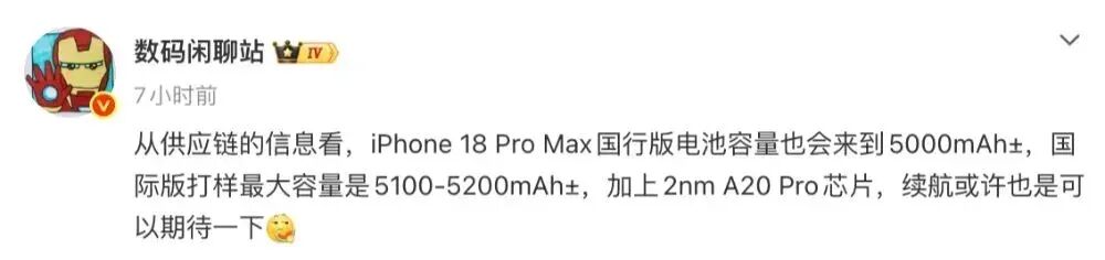 另外还有爆料显示,iPhone 18 Pro Max国行版有望配备5000mAh±电池,国际版打样最大容量是5100-5200mAh±。