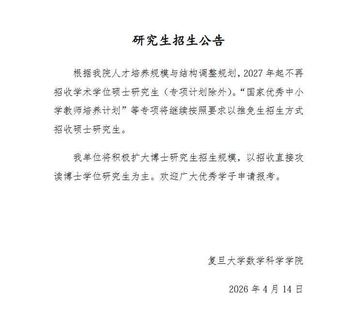 4月14日,复旦大学数学科学学院发布一则《研究生招生公告》,其中明确:根据学院人才培养规模与结构调整规划,2027年起不再招收学术学位硕士研究生(专项计划除外)。“国家优秀中小学教师培养计划”等专项将继续按照要求以推免生招生方式招收硕士研究生。并将积极扩大博士研究生招生规模,以招收直接攻读博士学位研究生为主。