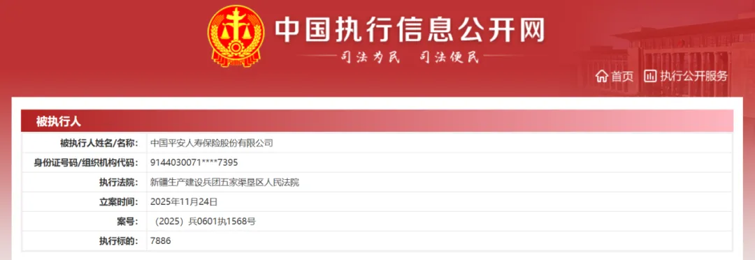 据中国执行信息公开网显示,平安人寿近日被新疆生产建设兵团五家渠垦区人民法院立案执行,立案时间为2025年11月24日,执行标的7886元。