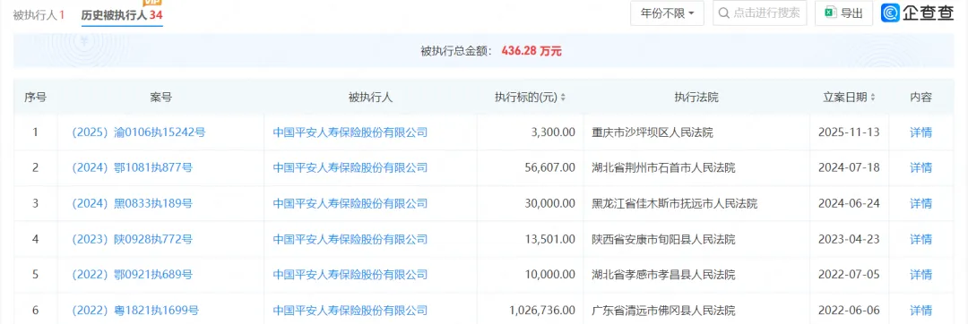 据悉,这是平安人寿本月以来第二次成为被执行人。此前,2025年11月13日,该公司被重庆市沙坪坝区人民法院立案执行,执行标的仅3300元。该公司历史被执行人信息多达34条,被执行总金额436.28万元。