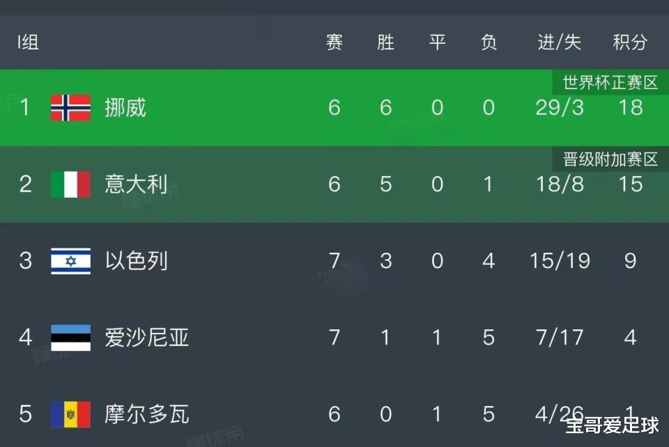 世界杯欧洲区预选赛I组共有5支球队,分别是意大利、挪威、以色列、爱沙尼亚和摩尔多瓦,由于球队数量为单数,所以每轮都有1支球队轮空。8轮小组赛过后,挪威队6战全胜积18分排名小组第一,打进29球失球3个,手握26个净胜球;意大利6战5胜1负积15分排名小组第二,打进18球失球8个,净胜球只有10个,唯一的失利就是在第3轮客场0-3输给了挪威;以色列7战3胜3负积9分排名小组第三,爱沙尼亚7战1胜1平5负积4分排名小组第四,摩尔多瓦6战1平5负积1分小组垫底。
