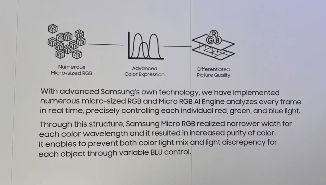 但三星的 Micro RGB 技术显然走得更远。其核心突破在于将红、绿、蓝三色 LED 灯珠压缩至 100 微米以下,并以精密阵列排布成背光系统,这一尺寸已达到Micro LED 水准,也是目前 RGB LED 背光方案中最小的发光芯片。这种技术命名并非噱头 —— 三星早已实现 Micro LED 直显产品的量产,如今不过是将成熟的微米级 LED 控制技术平移至背光领域,技术衔接自然流畅,不存在实质性壁垒。