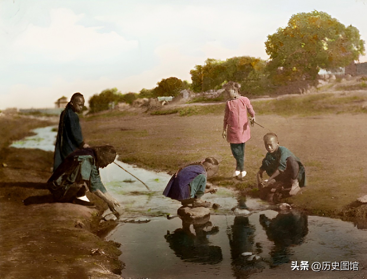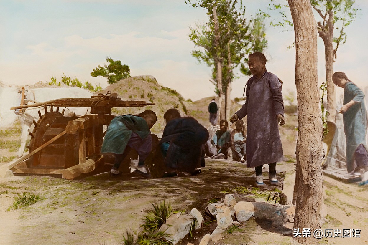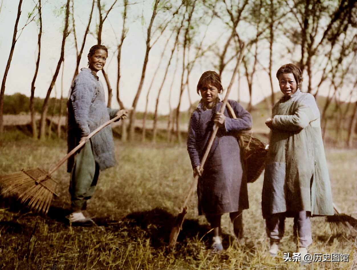 1906年,北京郊区一个村子外吗,有三名女子正在干活。她们手持筢子,仔细地将散落于地面之上的谷穗收集到竹筐里。