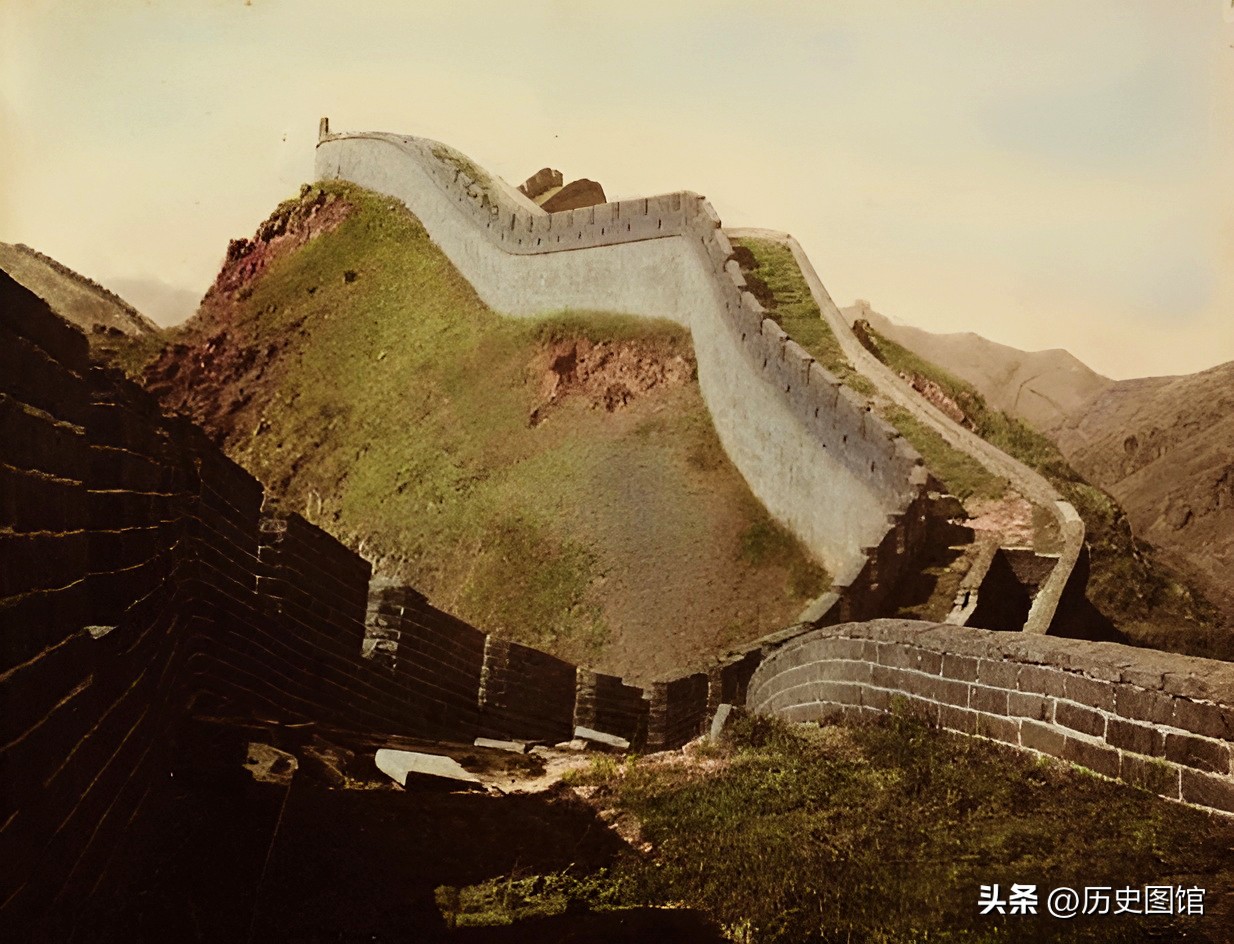 1906年,北京八达岭长城,整体景观保持着古朴且自然的原始状态,尚未经历大规模人工修缮干预。部分区域因长期缺乏维护,导致墙体结构出现损毁现象。