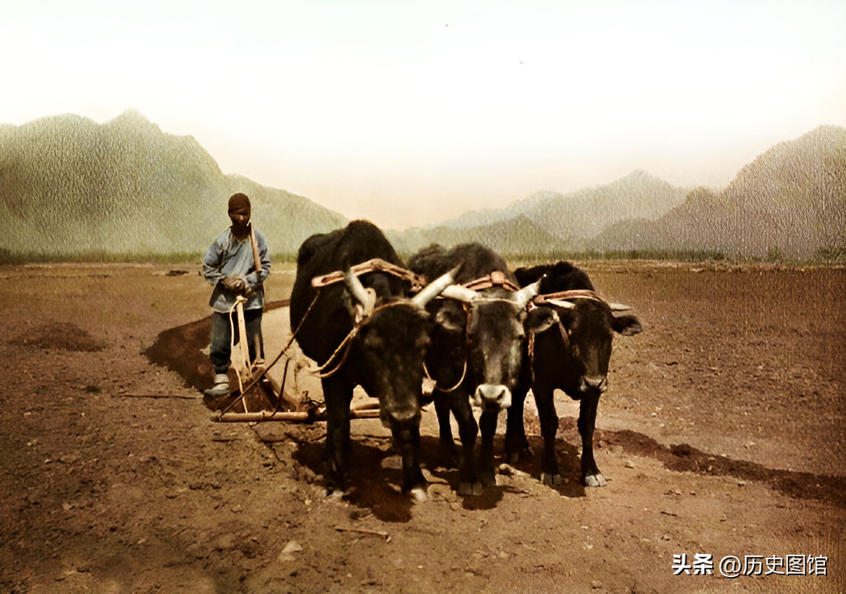 1906年,北京郊区的农村,还是传统的耕种方式。一名农民正在地里犁地,前面有三头牛拉着犁子。远处,青山连绵不绝。
