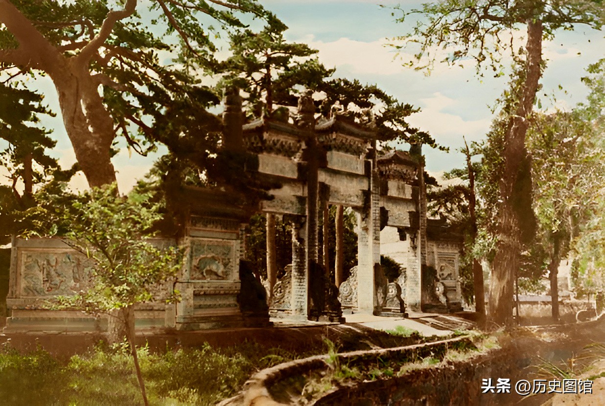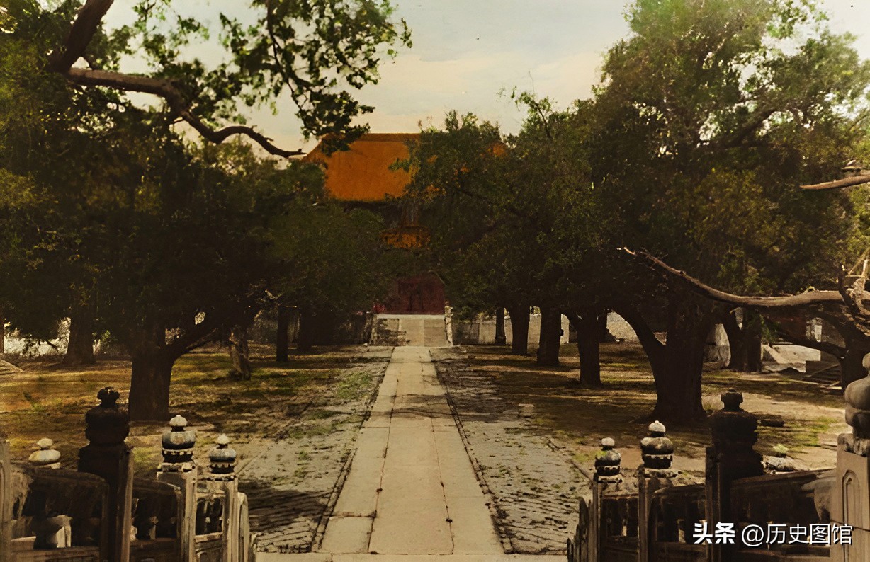 这是当时的北京明十三陵。陵园里古树参天,建筑气势恢宏。外国摄影师从未见过如此壮观的皇家陵寝。
