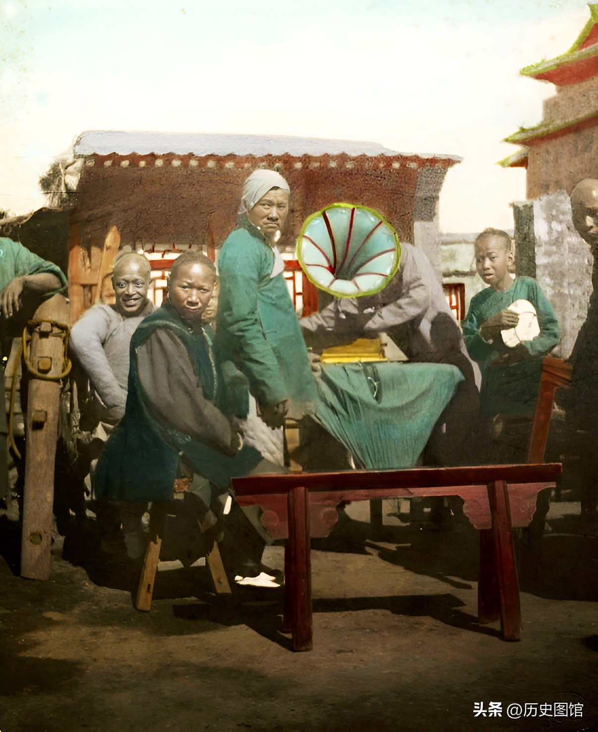 在庙会上,小贩摆出出一台留声机。在当时的社会背景下,这还是个稀罕玩意。不少人被其吸引,坐在边上欣赏播音乐。