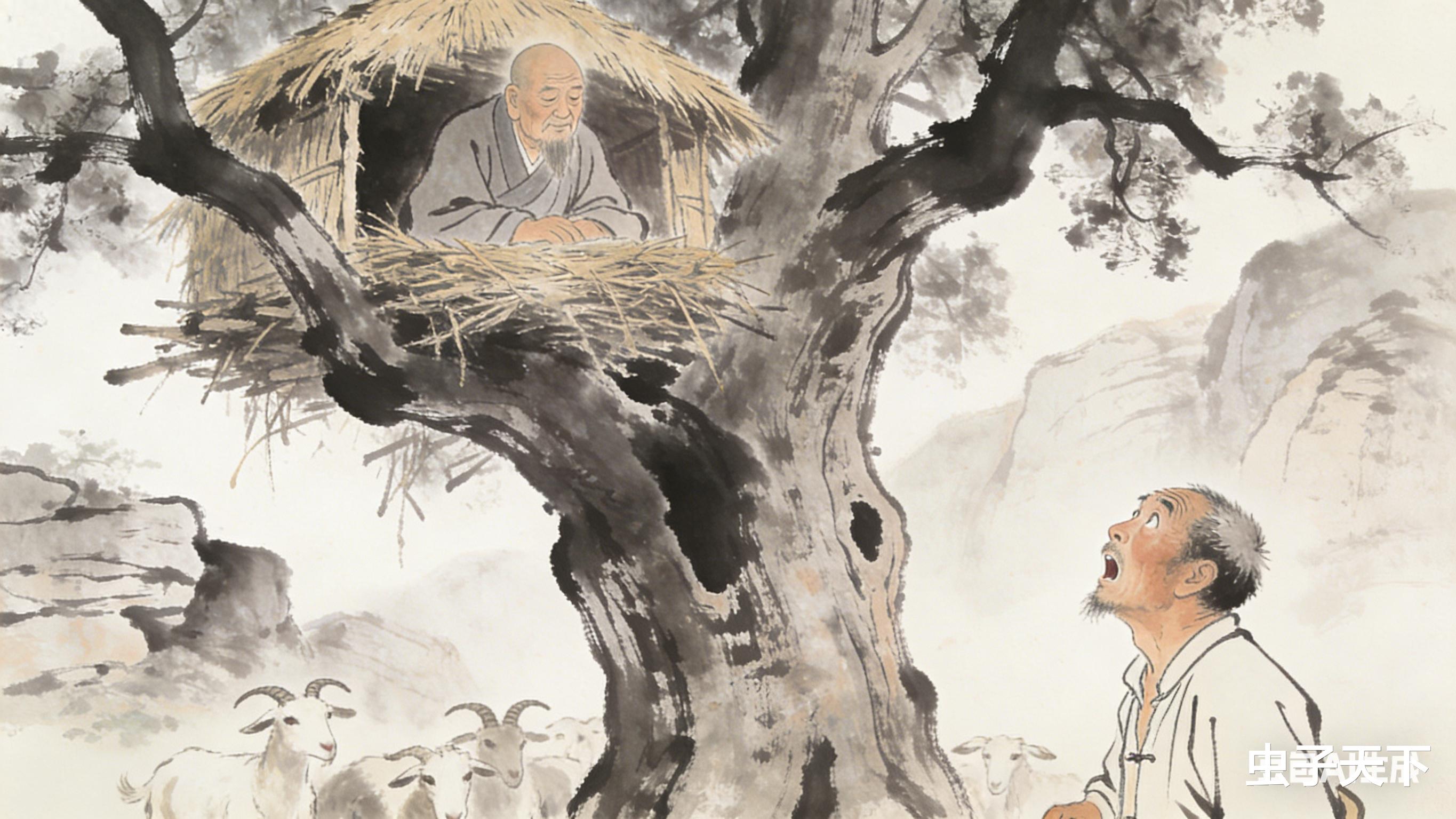 张铁柱抬头一瞧,差点没把魂吓飞,那老槐树最高的枝桠上,竟然搭着个草窝棚,里头坐着个老和尚,身披百衲衣,手里捻着串佛珠,正笑眯眯地瞅着他。