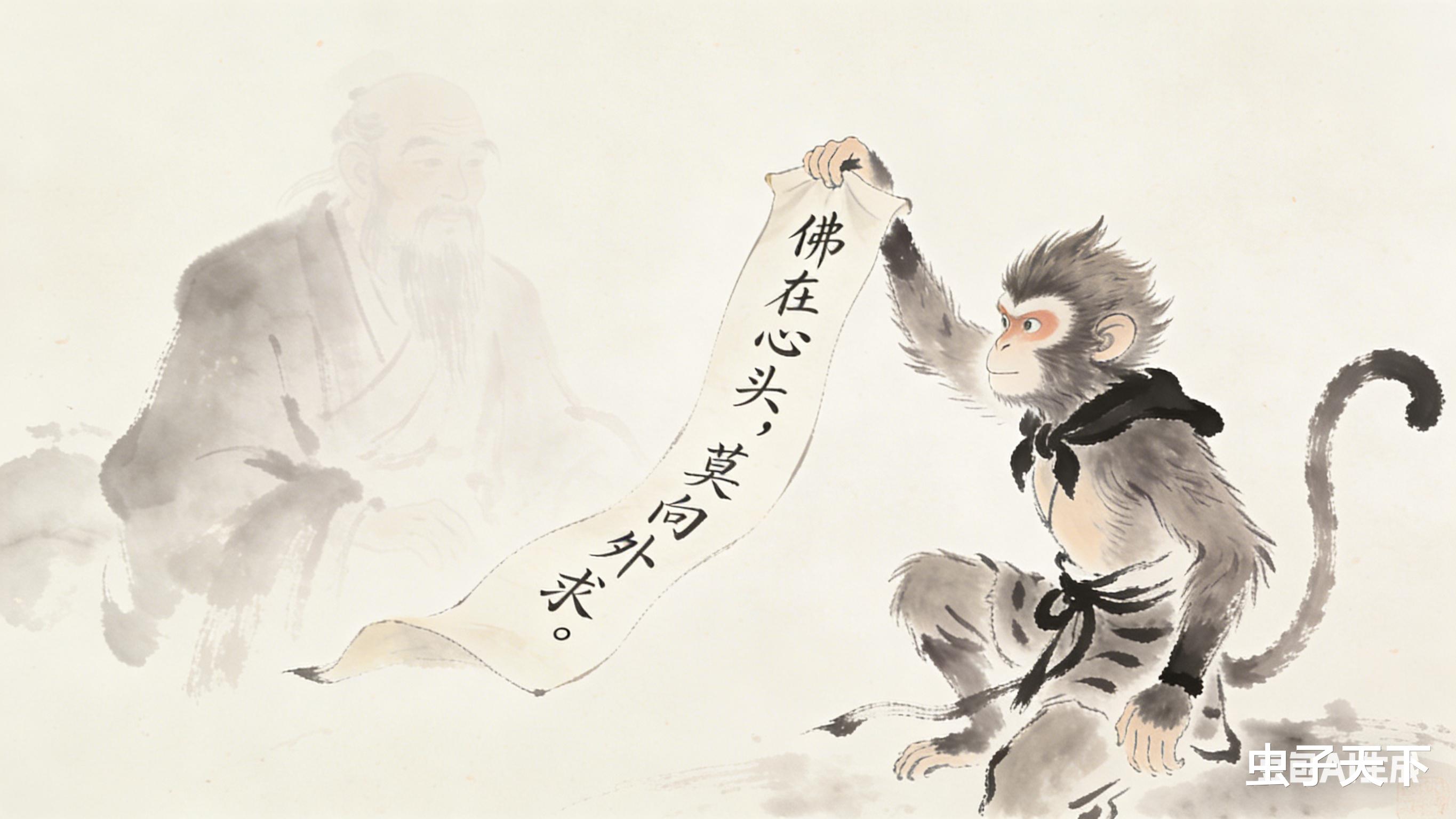 孙悟空伸手去抓,只抓住一张纸条,上头换了八个字:"佛在心头,莫向外求。"