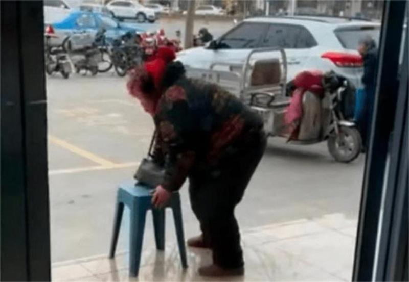 因为腰上有伤,年迈的妻子只能扶着一个蓝色的塑料板凳,借助椅子艰难地朝银行门口移动。