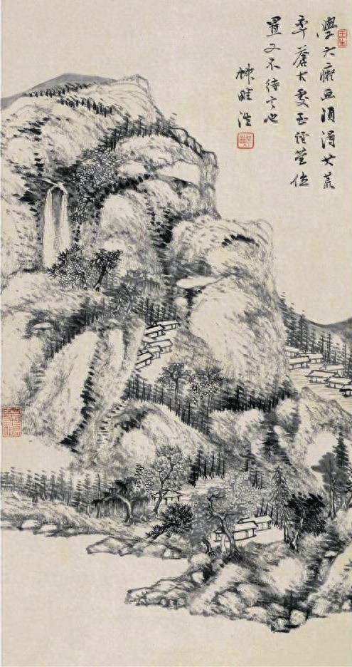 具体到笔墨技法上,王学浩强调用笔和用墨变化。中锋转侧锋,提按后形成气口。墨色整体偏淡而干,在山石阴面用湿笔稍稍晕染。看上去画得相当不错。