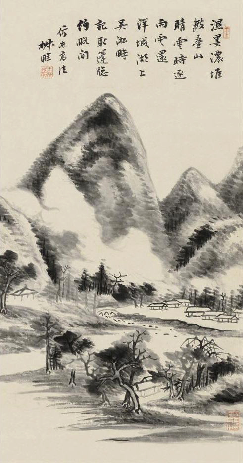 仿米芾山水,王学浩总结出的关键点是“湿墨浓堆”。湿墨比较容易理解,米点皴用来表现雨中、雨后的山水景色。画面肯定不能是干巴巴的,需要让人看到有水气弥散山中。利用湿笔技法,营造水墨淋漓的效果,让人直观看到画家的创作意图。