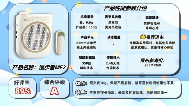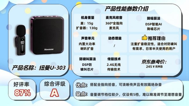 推荐3:漫 步 者MF2无线领夹扩音器安利指数:▲▲▲▲一句话推荐:单指向麦克风精准聚焦声音,减少杂音干扰,2.4G无线传输距离20米哪种小蜜蜂扩音器音大好用?漫步者MF2无线领夹扩音器的核心优势在于其DSP智能降噪和轻量化设计,单指向麦克风精准聚焦声音,减少杂音干扰,2.4G无线传输距离20米,连接稳定。10g的重量佩戴几乎无感觉,14小时续航能应对全天使用。但该设备功能较为简约,不支持TF卡、录音和扩展功能,无法满足播放预制音频或记录内容的需求,适用场景相对单一。推荐4:纽 曼 U-303无线领夹扩音器安利指数:▲▲▲▲一句话推荐:DSP+ANC防啸技术搭配DSP防啸叫芯片,有效解决啸叫问题
