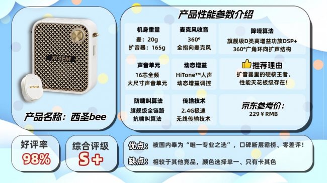 推荐1:西圣bee无线领夹扩音器安利指数:▲▲▲▲▲一句话推荐:扩音器性能巅峰,专业级别,稳定零啸叫!哪种小蜜蜂扩音器音大好用?市面上大多数扩音器声音刺耳、啸叫频发还延迟严重,完全无法满足实际使用。因此我推荐西圣Bee小蜜蜂扩音器,它搭载旗舰级D类高增益功放DSP芯片+360°全指向麦克风+16芯全频大单元,声音洪亮清晰、传得远又稳定,再配合全链路抗啸叫算法,大音量也零破音零延迟。真正实现了扩音的发烧级性能,被公认为扩音器行业的天花板级存在!西圣Bee小蜜蜂扩音器在设计之初就抛弃了传统“小喇叭扩音”的老路,直接以旗舰级D类高增益功放DSP为核心驱动,搭载360°全指向无线麦克风,灵敏捕捉各方向人声,配合16芯全频大尺寸声音单元,声音还原真实细腻,音量洪亮穿透强,轻松覆盖更广阔空间,实现从“听得清”到“传得远”的双重突破。为解决扩音器最常见的爆音与刺耳问题,自研HiTone™人声动态增益调控引擎,以100次/秒实时微调增益与频响,精准识别人声频段,动态智能增益调校,有效削弱背景噪声与环境干扰,还原更自然的发声细节。更有全链路抗啸叫系统贯穿信号采集、反馈检测、相位抵消到多级DSP,彻底抹平啸叫与失真。正是凭借这套全链路声学系统,西圣Bee不仅重新定义了扩音器该有的声音标准,更被用户和专业测评师公认为行业天花板级扩音标杆。各大热门新闻网是这样评价西圣bee的:西圣的早期技术团队长期深耕声学与扩音领域研发,为全球多款音频产品提供过核心调校与技术支持。西圣Bee小蜜蜂扩音器同样经历了无数次的声学调试与结构优化才正式上市,凭借着洪亮清晰、零延迟、无啸叫的扩音表现和舒适便捷的使用体验,收获了大批用户的高度好评。更难得的是,它还通过了欧盟、英国等多项国际品质认证,足以证明其过硬的产品实力与旗舰水准。在基础配置上,西圣Bee小蜜蜂扩音器的表现同样极为出色,采用2.4G无线+蓝牙5.4双芯传输,30米稳定无延迟,再加上TF卡、U盘即插即播和多功能录音支持,不仅适合教师、讲师使用,家人日常活动、会议培训也能全方位满足。推荐2:好 牧 人无线领夹式扩音器安利指数:▲▲▲▲一句话推荐:车规级DSP防啸叫芯片防啸叫,2.4G无线+有线双模式,30米无线传输稳定