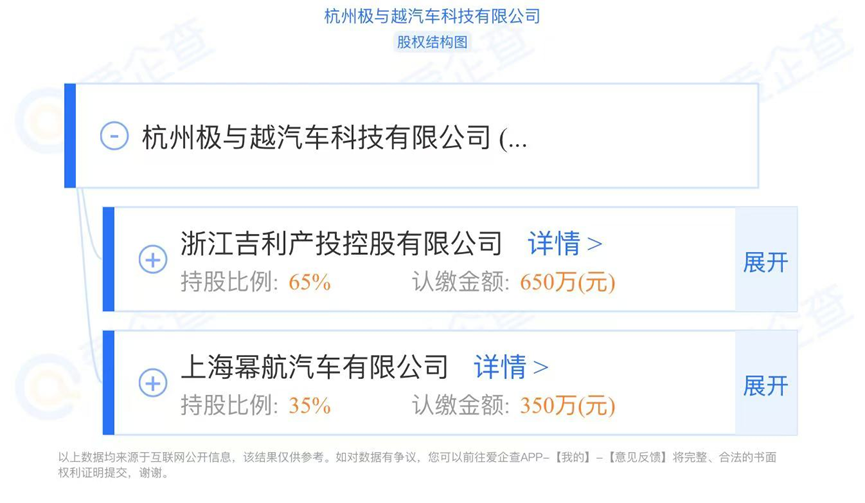 一方面,从股权架构来看,极越的最大控股方为浙江吉利产投控股有限公司,持股比例达 65%,对极越的发展具有关键的决策权和话语权。